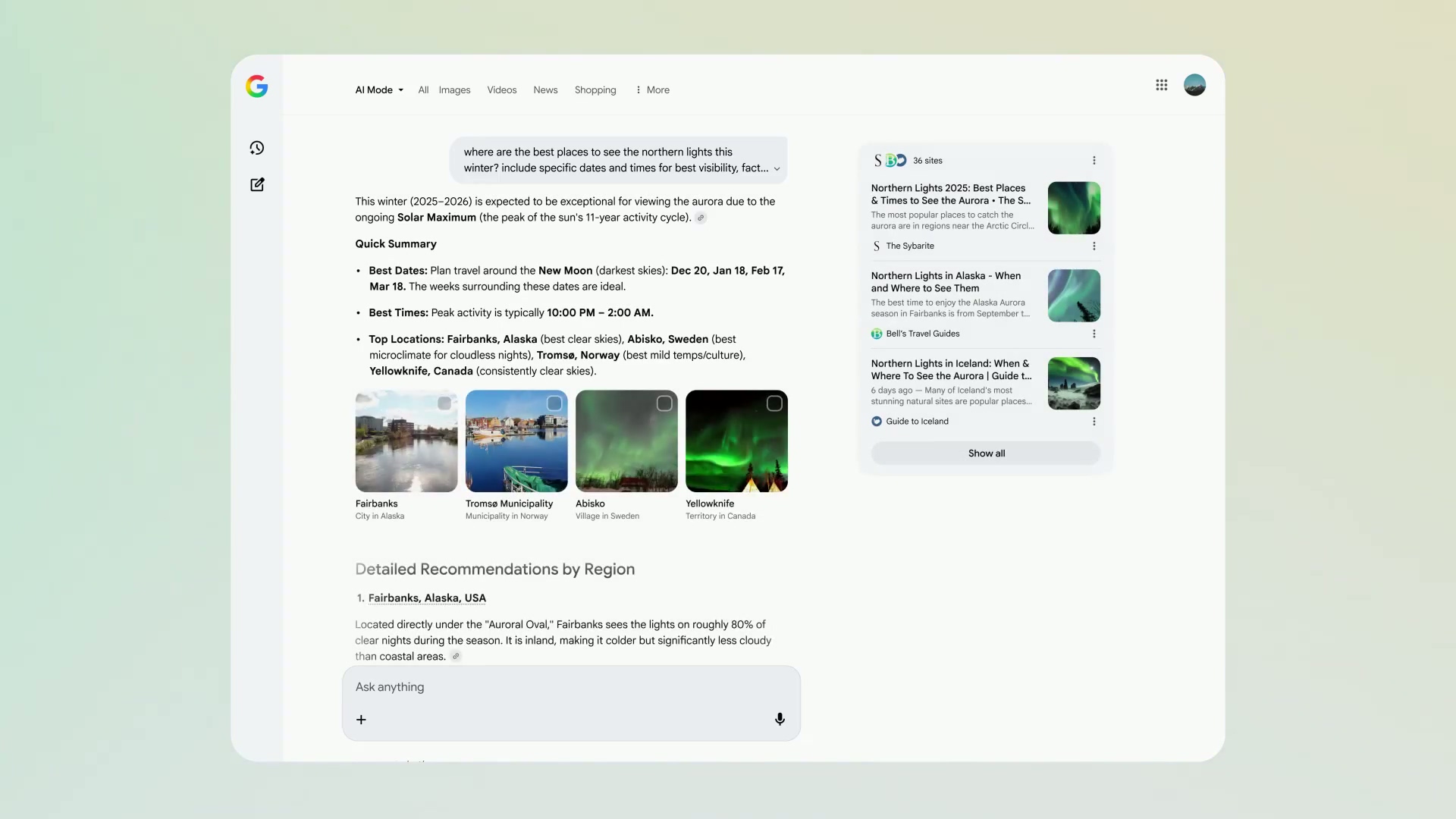 구글 검색의 최대 강점인 실시간성은 제미나이 3 플래시를 만나 더욱 강력해졌습니다. AI 모드는 웹 전반에서 수집한 최신 정보를 실시간으로 반영하며, 답변의 근거가 되는 유용한 링크를 함께 제공합니다.